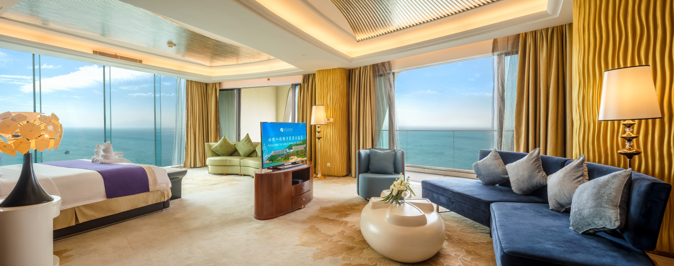 客房均設有觀景休閑陽臺,客人可欣賞東澳島原始森林景觀和伶仃洋海岸景觀。從53 ㎡豪華房到318 ㎡總統套房,再到546 ㎡海岸別墅,寬敞客房設計現代,配備48-65寸高清電視、有線& 無線網絡、獨立浴缸、電動窗簾等,讓您暢享奢華入住體驗。