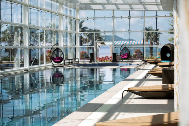 “海洋熱療”項目占地面積3500平方米,分為室內外泡池、經絡按摩、沐足、干濕蒸等部分。其中室內外共有16個海洋熱療泡池,包括臨崖湯苑、無邊際池、SPA水療池、養元浴等,另有13間帶私家泡池的豪華客房。